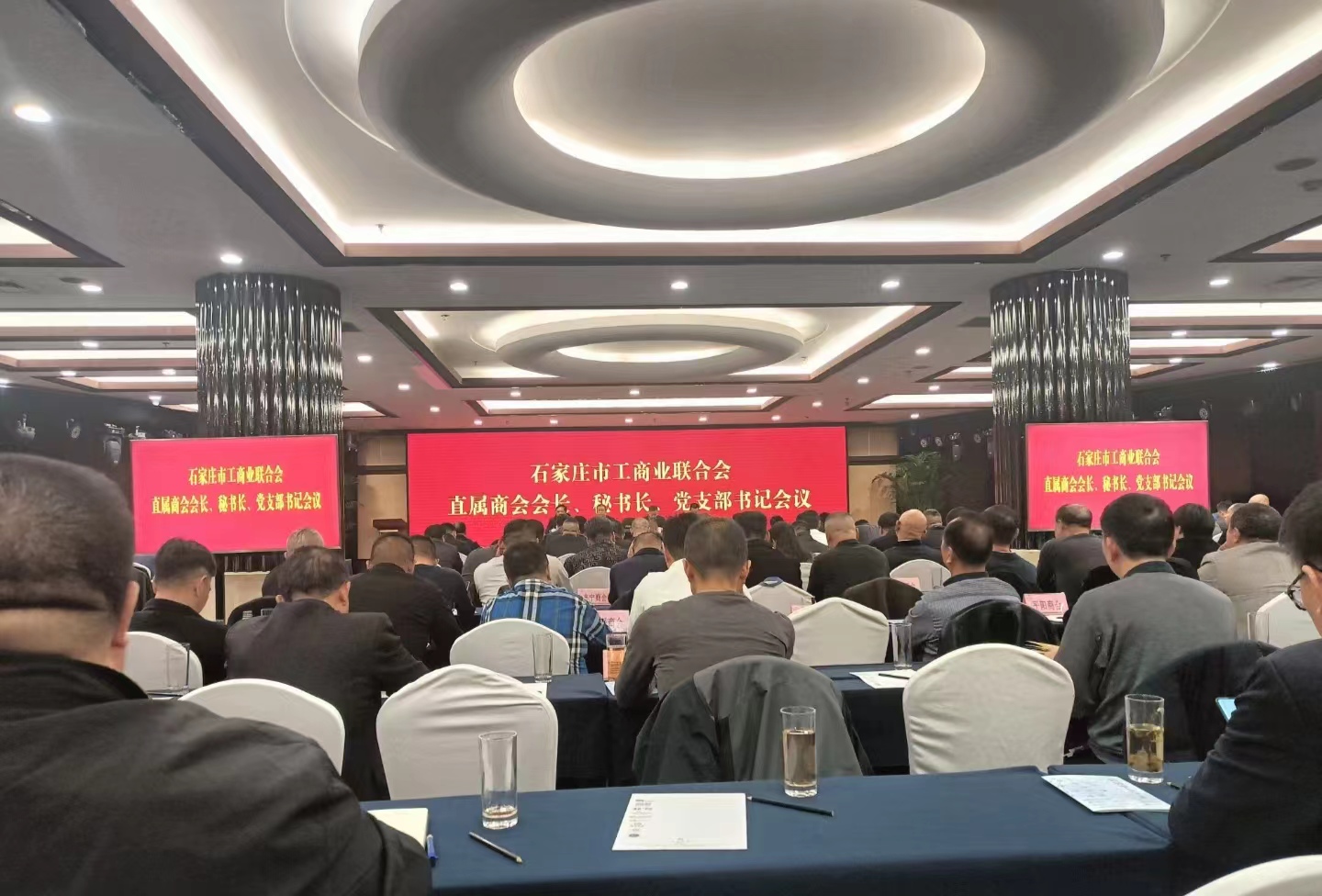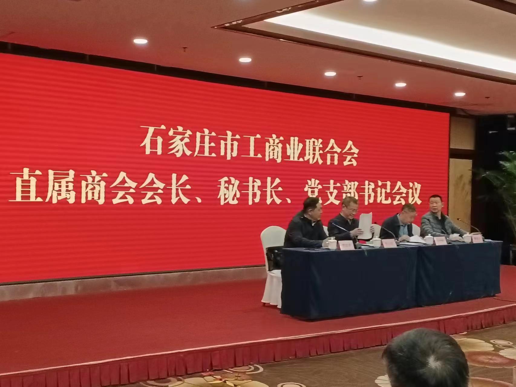 | 2024年3月22日下午,市工商联在云瑞国宾酒店组织召开”为强化商会正规化建设能力,加强直属商会党建工作水平”,直属商会会长、党支部书记、秘书长工作会议,总结去年工作,部署明年任务。首先,石家庄市工商联党组成员、副主席、三级调研员贾建勇同志讲评直属商会工作;第二项.石家庄市工商联党组副书记、常务副主席门立新同志宣读《关于认定2023年度全国“四好”商会的通报》、《关于命名河北省两新组织党建示范点的通知》、《关于命名石家庄市两新组织“A”级党组织的通知》;第三项.石家庄市委统战部副部长、市工商联党组书记李会强同志做进一步工作指示。最后观看《榜样第八季》。商会执行会长:廉宗田,支部书记:王国勇,秘书长:遆好恒,前往参加会议。